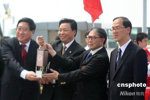 北京奧組委執(zhí)行副主席楊樹安(左二)與香港奧委會(huì)會(huì)長(zhǎng)霍震霆(右二)、中聯(lián)辦主任高祀仁(左一)等共舉圣火燈。 中新社發(fā) 沈晨 攝