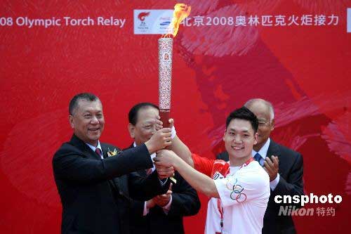 圖為澳門特別行政區(qū)行政長官何厚鏵將火炬交給首棒火炬手、武術(shù)運動員梁洪敏。中新社發(fā) 武仲林 攝
