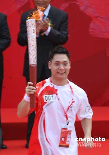 圖為澳門首棒火炬手梁洪敏跑出起跑儀式現(xiàn)場。中新社發(fā) 武仲林 攝