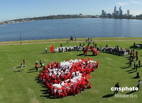 當?shù)貢r間5月3日上午,三所西澳大利亞中文學校的二百多名7-14歲的孩子在西澳首府珀斯天鵝河畔,組成北京奧運會徽圖及澳大利亞地圖表達對北京奧運的支持。與此同時,13個西澳華人社團的代表向西澳參加北京奧運的運動員捐贈了五萬澳幣(近四十萬人民幣),表達西澳洲華人對澳大利亞體育事業(yè)的支持。 中新社發(fā) 高周丹 攝