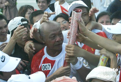 鄭文泰作為第一棒火炬手,其傳遞結(jié)束后,數(shù)百名農(nóng)場(chǎng)歸僑競(jìng)相觸摸其手中的火炬。