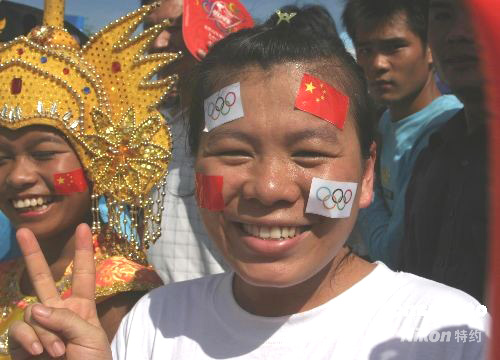 一名歸僑女子在臉上貼滿奧運五環(huán)旗和五星紅旗,滿懷欣喜迎圣火。中新社發(fā) 尹海明 攝