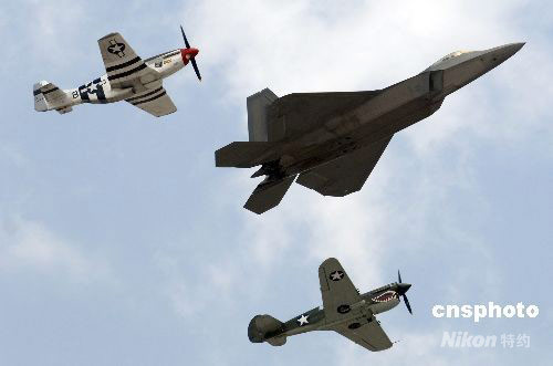 當(dāng)?shù)貢r(shí)間5月4日,一架美軍最先進(jìn)的F-22猛禽戰(zhàn)機(jī)(中)與二戰(zhàn)時(shí)期的美軍戰(zhàn)機(jī)P-51和P-40空中共舞,讓人們體驗(yàn)航空科技的突飛猛進(jìn)。當(dāng)天,位于美國(guó)南加州河濱縣的一個(gè)美國(guó)空軍預(yù)備基地舉行規(guī)模盛大的航空展和飛行表演。C-17A全球霸王運(yùn)輸機(jī)、C-5銀河運(yùn)輸機(jī)等空中巨無(wú)霸和F-22猛禽戰(zhàn)機(jī)等美軍先進(jìn)軍用飛機(jī)亮相展覽,F(xiàn)-22戰(zhàn)機(jī)飛行表演、美國(guó)空軍“雷鳥”飛行隊(duì)的特技表演等令近十萬(wàn)民眾大飽眼福。中新社發(fā) 張煒 攝