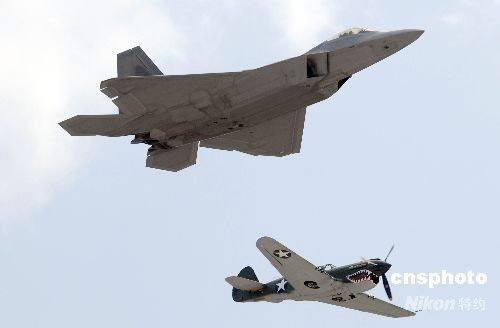 一架美軍最先進(jìn)的F-22猛禽戰(zhàn)機(jī)與二戰(zhàn)時(shí)期的美軍戰(zhàn)機(jī)P-40空中共舞,讓人們體驗(yàn)航空科技的突飛猛進(jìn)。中新社發(fā) 張煒 攝