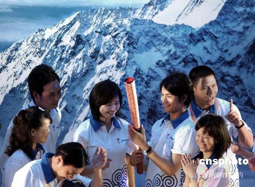 奧運圣火傳遞火炬手演藝明星陳坤、聯(lián)想集團副總裁李嵐等在珠穆朗瑪峰巨幅招貼畫前端詳祥云火炬。中新社發(fā) 廖攀 攝