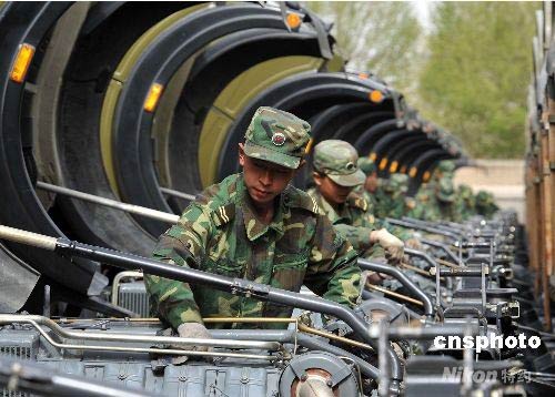 5月7日,常年擔(dān)負(fù)青藏線(xiàn)運(yùn)輸任務(wù)的解放軍總后勤部青藏兵站部某汽車(chē)團(tuán)官兵在集中檢查保養(yǎng)車(chē)輛。 總后勤部青藏兵站部某汽車(chē)團(tuán),在自然條件惡劣、運(yùn)輸任務(wù)繁重的情況下,連續(xù)多年圓滿(mǎn)完成任務(wù)。高原汽車(chē)兵是支援西藏的保障部隊(duì),他們穿行"生命禁區(qū)",闖過(guò)"死亡地帶",在海拔平均4500多米、2000公里長(zhǎng)的青藏線(xiàn)上奔跑著。從1954年第一批青藏兵站官兵挺進(jìn)雪域高原,到如今已是54年了。54年來(lái),兵站部累計(jì)承運(yùn)各類(lèi)物資700余萬(wàn)噸,接待過(guò)往人員逾億餐次,收發(fā)各類(lèi)物資3000多萬(wàn)噸。先后參加搶險(xiǎn)救災(zāi)百余次,搶救遇險(xiǎn)群眾25000多人。中新社發(fā) 吳蘇琳 攝