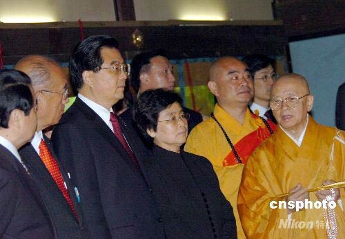 5月9日上午,胡錦濤及夫人劉永清在日本奈良冒雨參觀了著名的唐招提寺。圖為該寺長(zhǎng)老在向胡錦濤夫婦介紹御影堂中陳列的日本國(guó)寶——鑒真和尚坐像。中新社發(fā) 朱沿華 攝