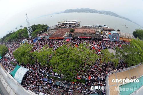 5月10日,圣火盆于16時(shí)18分在汕頭市人民廣場(chǎng)點(diǎn)燃,這標(biāo)志著北京奧運(yùn)圣火廣東省傳遞圓滿落幕。圖為當(dāng)圣火在中國(guó)跳水隊(duì)汕頭集訓(xùn)基地的露天跳水臺(tái)進(jìn)行傳遞的時(shí)候,毗鄰汕頭灣的街道上人潮洶涌護(hù)擁圣火。 中新社發(fā) 廖攀 攝