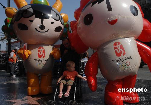 一名洛杉磯幼童被奧運(yùn)福娃深深吸引。中新社發(fā) 張煒 攝