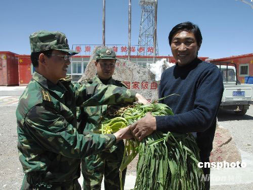 5月10日,青藏高原行車的中國汽車兵路過位于青海省可可西里國家自然保護區(qū)的索南達杰保護站,把新鮮的蔬菜和副食品送到工作人員手中。中新社發(fā) 吳蘇琳 攝