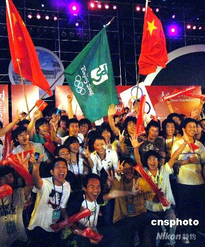 眾多福州青年在北京奧運(yùn)會火炬接力境內(nèi)傳遞福建福州站慶典儀式上,激情飛揚(yáng)歡慶奧運(yùn)圣火福州成功傳遞。中新社發(fā) 劉可耕 攝