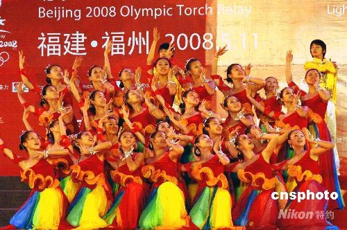 5月11日晚,為慶祝奧運圣火福州傳遞圓滿成功,北京奧運會火炬接力境內(nèi)傳遞福建福州站慶典儀式文藝晚會在福州望龍臺公園舉行。中新社發(fā) 劉可耕 攝
