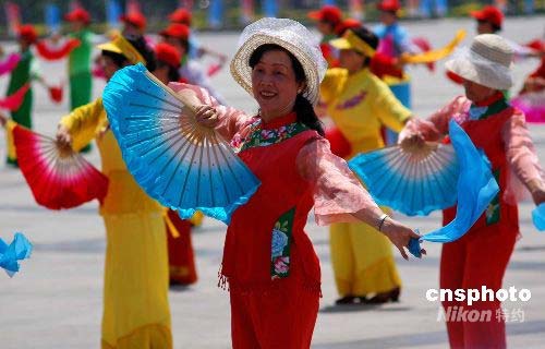 圖為廈門(mén)市民在烈日下歡歌起舞,迎接圣火。 中新社發(fā) 傅丹丹 攝
