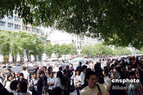 2008年5月12日下午,河南省會鄭州受到四川地震波及,該市農(nóng)業(yè)路上站滿了疏散的市民。中新社發(fā) 李志全 攝