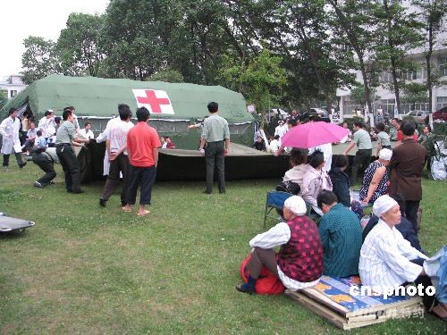 四川汶川縣發(fā)生7.8級地震。成都受到波及,也發(fā)生5.4級地震。位于成都北郊的成都軍區(qū)總醫(yī)院接收了來自地震災區(qū)的100多名傷員。在積極組織搶救的同時,醫(yī)院搭建10余頂大型帳篷,將住院的1000多名患者全部安全轉(zhuǎn)移。中新社發(fā) 朱琥 攝