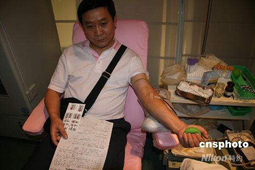 5月12日晚7時(shí)許至13日凌晨,數(shù)千成都市民前往市內(nèi)各獻(xiàn)血點(diǎn)獻(xiàn)血,為四川地震災(zāi)區(qū)的人們獻(xiàn)上愛心。圖為田先生在林蔭街武侯愛心獻(xiàn)血屋獻(xiàn)血。 中新社發(fā) 楊杰 攝