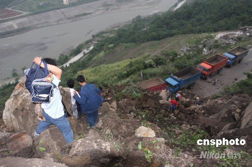 5月12日14時(shí)28分,四川汶川縣(北緯31度,東經(jīng)103.4度)發(fā)生7.8級(jí)地震,離都江堰市區(qū)5公里的水井灣大橋發(fā)生大面積塌方,通往汶川的道路全線阻擋。圖為困在塌方區(qū)域的居民前往安全區(qū)域。 中新社發(fā) 黃榮 攝