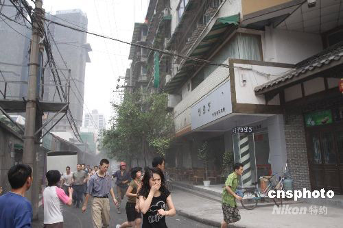 5月12日14時(shí)28分,在四川汶川縣(北緯31度,東經(jīng)103.4度)發(fā)生7.8級(jí)地震,四川省會(huì)成都有強(qiáng)烈震感,市民緊急從建筑物中跑出來(lái),在街道上緊急避險(xiǎn),全城交通因此受阻。 中新社發(fā) 鄒輝 攝