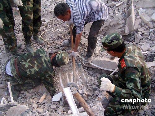 5月12日下午,四川汶川發(fā)生7.8級(jí)地震,導(dǎo)致重慶梁平縣文化鎮(zhèn)中心小學(xué)坍塌,武警重慶總隊(duì)梁平縣中隊(duì)官兵在中隊(duì)指導(dǎo)員唐兵的帶領(lǐng)下緊急趕赴現(xiàn)場(chǎng)展開(kāi)搜救。經(jīng)過(guò)官兵們連續(xù)6個(gè)小時(shí)的艱苦奮戰(zhàn),從廢墟中成功救出11名師生。(李剛、陳萬(wàn)金、秦龍兵攝影報(bào)道)