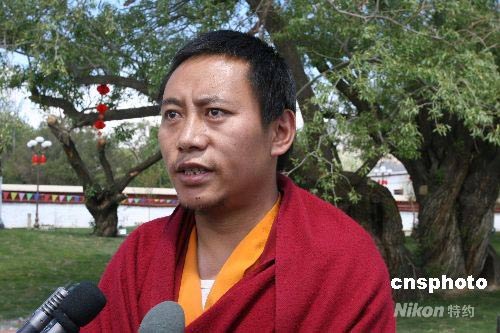 四川汶川大地震發(fā)生后,引起西藏宗教界極大關(guān)注,5月13日,拉薩哲蚌寺部分僧人代表在參觀完“三·一四”暴力事件中被燒毀的拉薩市第二中學(xué)教學(xué)樓、被毀店鋪和新改近造完工的羅布林卡廣場(chǎng)等處后表示,明天該寺將舉行主題祈福法會(huì),為四川汶川地震災(zāi)區(qū)民眾祈福。圖為僧人平措塔青在祝福災(zāi)區(qū)民眾。中新社發(fā) 柳俊武 攝