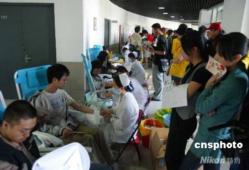 5月13日,清華大學(xué)紅十字會提出了“真情流淌 血脈相通”為汶川災(zāi)區(qū)緊急獻血的倡議,學(xué)子們踴躍參與。