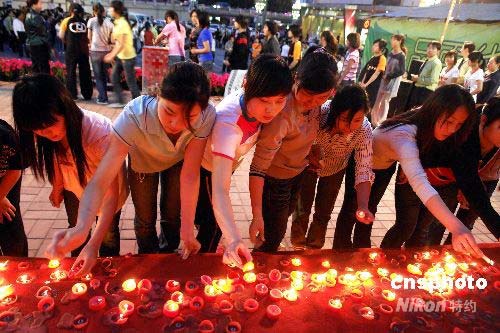 2008年5月13日,鄭州市紫荊山百貨門前,商場員工點起512支蠟燭,在燭光中,商場員工為汶川地震災(zāi)區(qū)的受災(zāi)群眾祈福,并且現(xiàn)場通過紅十字會為災(zāi)區(qū)捐款,表達(dá)愛心。中新社發(fā) 馬健 攝