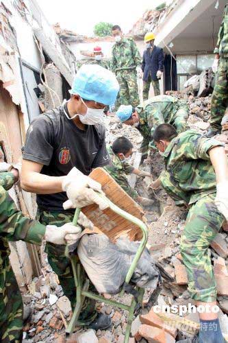5月14日,成都軍區(qū)某特種大隊?wèi)?zhàn)士在清理地震廢墟現(xiàn)場。