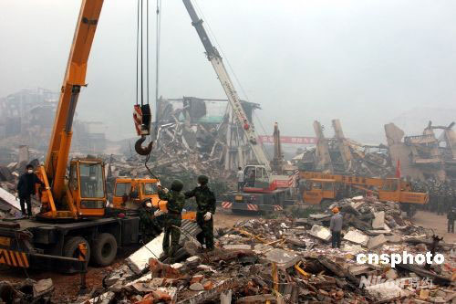 5月14日,在四川什邡市救災(zāi)的空降兵某部官兵用重型機械清理地震廢墟現(xiàn)場。