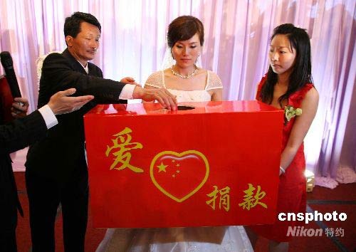 新娘邱媛媛和新郎饒新的家人在婚禮現場向四川災區(qū)捐贈2萬元人民幣。中新社發(fā) 鐘山 攝