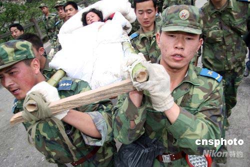 地震發(fā)生后,中國(guó)人民解放軍官兵迅速趕往四川各個(gè)災(zāi)區(qū)全力進(jìn)行救助,被災(zāi)區(qū)人民親切的稱為“親人解放軍”。中新社發(fā) 黃家明 攝