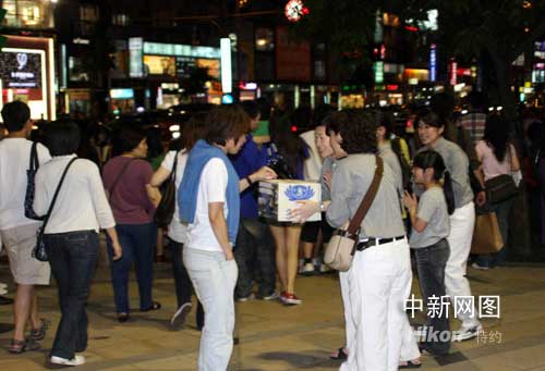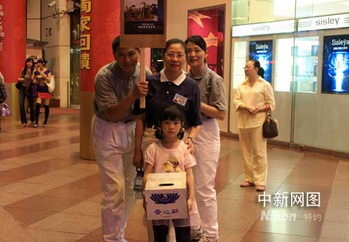 十七日晚,慈濟(jì)臺(tái)北分會(huì)的義工在臺(tái)北市的街上為四川震災(zāi)與緬甸風(fēng)災(zāi)募款,兒童也加入行列。作 者:陳立宇