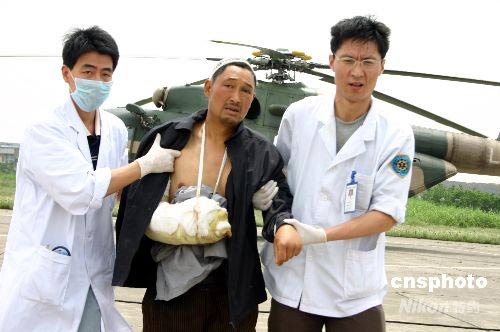 5月18日11時35分,一架軍用直升機(jī)載著11名臺灣游客,從四川汶川起飛,于12時許平安抵達(dá)成都鳳凰山機(jī)場。他們是臺灣祥鶴旅行社14人游客團(tuán)中脫困的首批游客,另3人將于下午搭乘另一架直升機(jī)脫離險境。圖為救護(hù)人員攙扶臺灣游客上車。中新社發(fā) 楊杰 攝