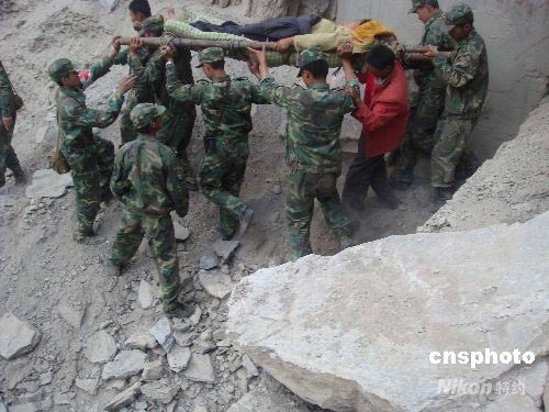 5月18日,成都軍區(qū)駐渝某集團軍紅軍師步兵團在汶川大地震茂縣懸崖峭壁的羌寨,冒著余震塌方解救兩位女傷員,傍晚成功送到前來支援的解放軍第二軍醫(yī)大學(xué)醫(yī)療隊。中新社發(fā) 賈國榮 攝