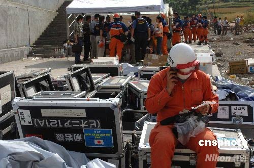 5月18日,日本國(guó)際救援隊(duì)一行二十余人到達(dá)中國(guó)四川北川地震現(xiàn)場(chǎng)——北川中學(xué),利用國(guó)際先進(jìn)的探測(cè)儀器與中國(guó)兩支救援隊(duì)分別挖掘廢墟,救援受難學(xué)生。經(jīng)過共同探測(cè),在沉入地下的樓層內(nèi)發(fā)現(xiàn)有三個(gè)生物體存在,但挖掘極為危險(xiǎn)和困難,生者生命渺茫。圖為日本救援隊(duì)成員在休息時(shí)依然思考救援問題。中新社發(fā) 鄒憲 攝