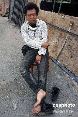 四川汶川大地震發(fā)生時在映秀鎮(zhèn)遭遇山體坍方而受重傷的《北京晚報》攝影記者甘南,堅持在當?shù)夭稍L到5月18日才在同事的陪伴下撤離。中新社發(fā) 任晨鳴 攝