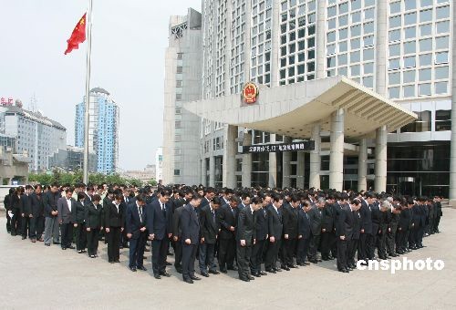 5月19日,中國外交部全體人員在外交部主樓外舉行莊重的默哀活動,表達(dá)對四川汶川大地震罹難同胞的深切哀悼。中新社發(fā) 廖文靜 攝