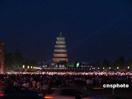 2008年5月19日晚,在西安大雁塔北廣場,上萬市民手持蠟燭自發(fā)為在汶川大地震中遇難的同胞們致哀。
