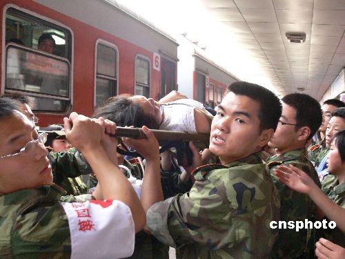5月21日早7時(shí)許,一列運(yùn)送四川地震傷員的專列徐徐駛?cè)胛靼部瓦\(yùn)站,早已等待就緒的醫(yī)務(wù)人員馬上將傷員轉(zhuǎn)送至醫(yī)院接受治療。據(jù)了解,這列運(yùn)送傷員的專列是20日下午4時(shí)從四川綿陽(yáng)發(fā)車(chē)的,車(chē)上共有傷員248人,車(chē)上解放軍第四軍醫(yī)大學(xué)專門(mén)抽調(diào)了30余名醫(yī)務(wù)人員全程陪護(hù),到達(dá)西安客運(yùn)站后,傷員將被救護(hù)車(chē)全部接到第四軍醫(yī)大學(xué)附屬醫(yī)院西安西京醫(yī)院和唐都醫(yī)院接收治療,目前西京醫(yī)院已經(jīng)提前準(zhǔn)備了500張床位以收治更多的地震傷員。中新社發(fā) 楊志濤 攝