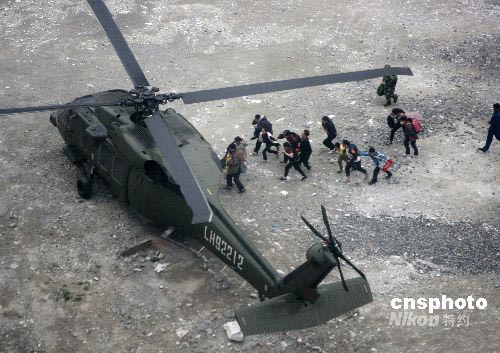 一批震中區(qū)的男女老少正緊急登上成都軍區(qū)陸航團(tuán)的救援飛機(jī)前往成都。中新社發(fā) 賈國(guó)榮 攝