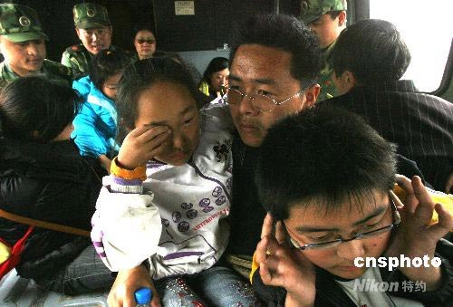 一批震中地區(qū)的男女老少登上成都軍區(qū)陸航團(tuán)的救援飛機(jī),前往成都。中新社發(fā) 賈國(guó)榮 攝