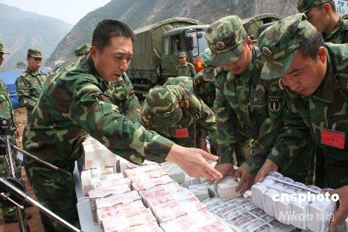5月22日,第二炮兵某技術(shù)總隊(duì)政委高海華將620多萬(wàn)元人民幣金庫(kù)庫(kù)款、重要資料等清單移交給了綿陽(yáng)市農(nóng)村信用聯(lián)社負(fù)責(zé)人陳利雄。四川省北川縣信用聯(lián)社八層大樓,是北川縣損壞最嚴(yán)重的建筑之一,里面不但埋有多名工作人員,而且還有存放大量資金的國(guó)家金庫(kù)。5月15日上午,第二炮兵某技術(shù)總隊(duì)接到任務(wù)后,立即組織了由86名專業(yè)技術(shù)骨干組成的搜救隊(duì),攜帶挖掘機(jī)、切割機(jī)、生命探測(cè)儀等設(shè)備火速趕往該聯(lián)社進(jìn)行被埋人員和金庫(kù)庫(kù)款的搶救。共營(yíng)救出9名幸存者,并于21日晚成功搶救出金庫(kù)庫(kù)款620多萬(wàn)元和大量寶貴資料。圖為救援人員認(rèn)真清點(diǎn)現(xiàn)金。中新社發(fā) 陳雙維 攝