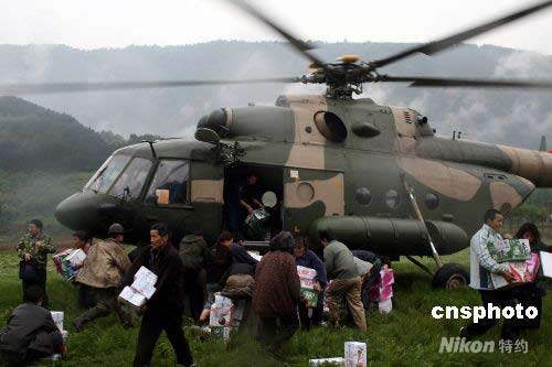 5月14日10時45分,成都軍區(qū)某陸航團四架直升機抵達四川大地震震中汶川縣。這是災后第一次成功降落到汶川災區(qū)的飛機,為受災群眾送去了生活必需品。中新社發(fā) 張雷 黃龍 攝