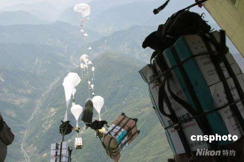 5月16日,中國空軍航空兵某師在向四川地震災區(qū)空投救災物資?哲姲l(fā)揮空中運輸優(yōu)勢,連續(xù)出動大型運輸機,不間斷大規(guī)模向四川災區(qū)投送災民急需的藥品、食物、帳篷等急需的生活用品。中新社發(fā) 譚超 攝