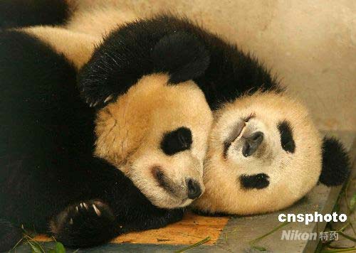 5月26日,來自四川臥龍的8只奧運大熊貓在北京動物園開始了新的生活。此次進京的8只奧運大熊貓,是今年3月21日啟動的“2008四川臥龍大熊貓奧運北京行”投票評選活動中,由廣大網(wǎng)民從16只大熊貓里選出來的。這8只熊貓,雌雄各半,現(xiàn)在的年齡都在1歲9個月之間,屬亞成體,正是最活潑可愛的年華。圖為兩只大熊貓在互相依偎著休息。 中新社發(fā) 富田 攝
