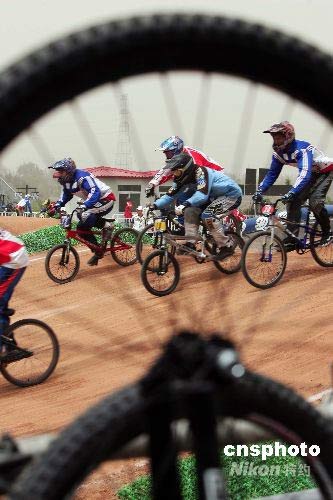 2008國際自行車聯(lián)盟BMX(小輪車)世界錦標賽將于5月28日晚在山西省太原市拉開戰(zhàn)幕。33個國家的870多名運動員參加此次比賽。5月27日上午,先期到達的國外運動員抓緊時機,熟悉場地。中新社發(fā) 張云 攝