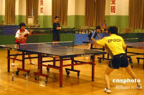五月二十七日,四川省乒乓球運動員在河南鄭州進(jìn)行緊張的訓(xùn)練。連日來,為避免地震的影響,四川省包括游泳、射擊、乒乓球、網(wǎng)球、跆拳道等六支運動隊九十多名運動員轉(zhuǎn)移到河南鄭州進(jìn)行訓(xùn)練,以全力備戰(zhàn)北京奧運會和明年舉行的全運會。 中新社發(fā) 史寶銀 攝
