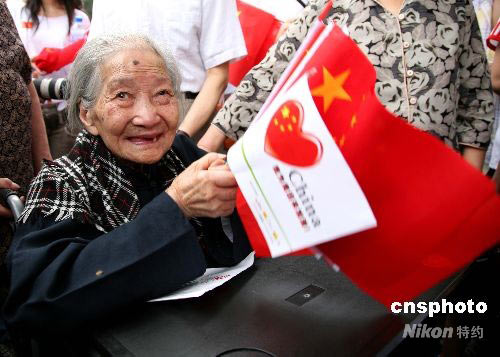 5月27日,奧運會圣火在江蘇南京傳遞,112歲的胡家芝老人在家人的陪伴下,來到火炬?zhèn)鬟f現(xiàn)場南京市北京西路,與周圍的群眾一道為火炬?zhèn)鬟f加油。 中新社發(fā) 鐘山 攝