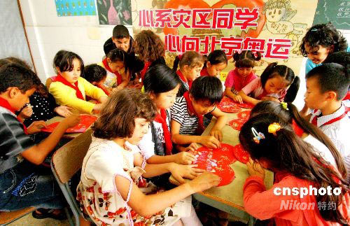 5月29日上午,浙江義烏群星學(xué)校舉行“心系災(zāi)區(qū)學(xué)生 心向北京奧運(yùn)” 慶“六一” 活動(dòng)。全校2300多名學(xué)生與147名外籍學(xué)生,在各自的心愿卡上寫下祝福話語(yǔ),祝愿四川地震災(zāi)區(qū)小朋友“六一”快樂,祝愿北京奧運(yùn)會(huì)圓滿成功。中新社發(fā) 張建成 攝