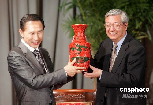 圖為北京大學校長許智宏(右)向李明博贈送禮物。中新社發(fā) 張宇 攝