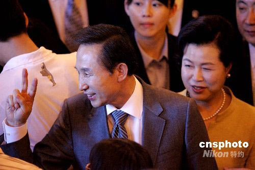 圖為韓國總統(tǒng)李明博在北京大學(xué)發(fā)表演講后,向?yàn)槠渑恼盏膶W(xué)生們擺POSS。中新社發(fā) 張宇 攝